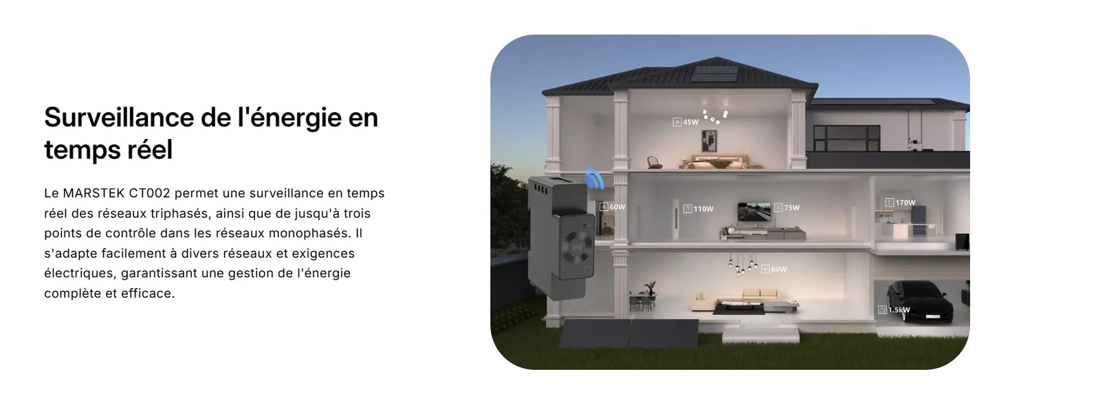Le MARSTEK CT002 prend en charge la surveillance en temps réel des systèmes triphasés, mais aussi jusqu'à 3 points des systèmes monophasés. Il s'adapte parfaitement à différents systèmes et besoins électriques, garantissant une gestion énergétique complète et efficace.