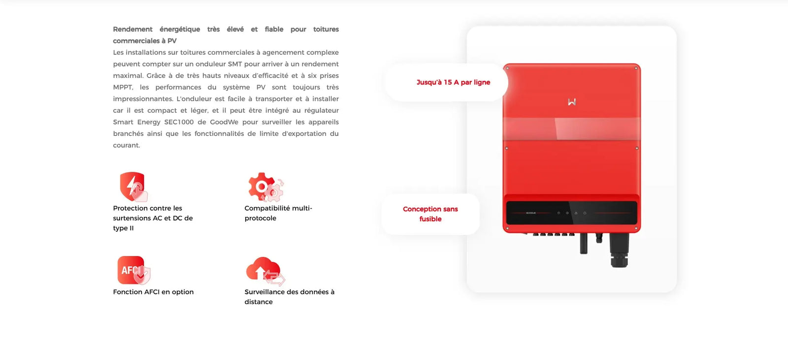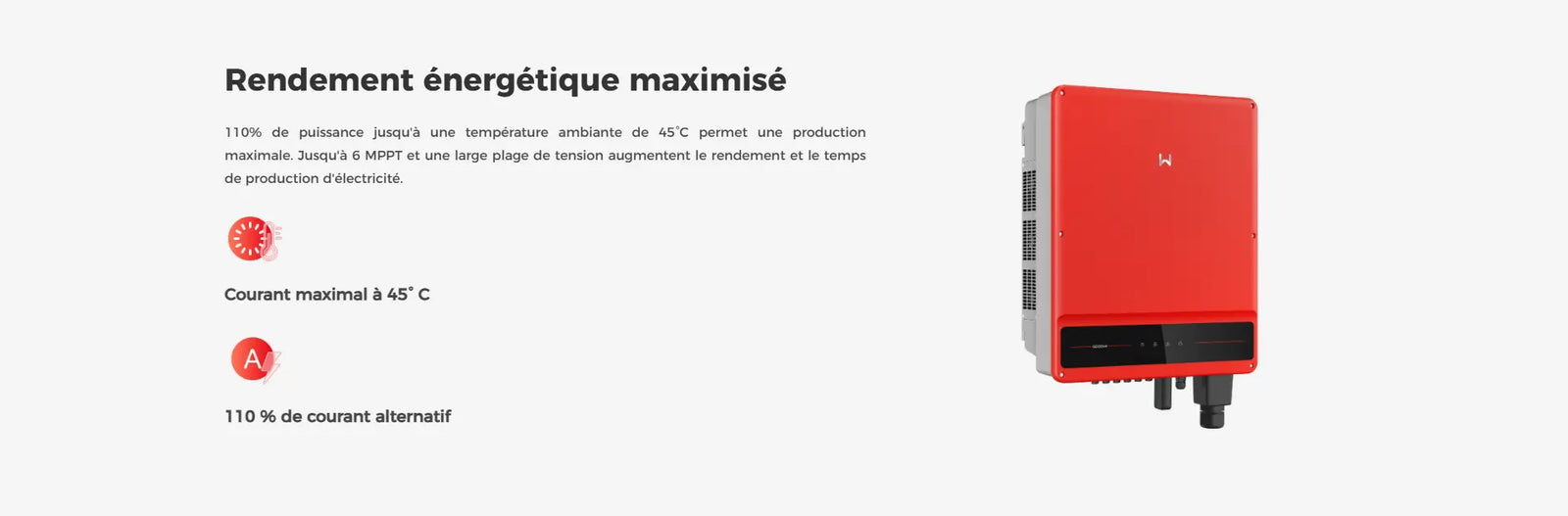 Avec une puissance de sortie de 50 kW et 5 trackers MPPT indépendants, l’onduleur permet une gestion intelligente de plusieurs chaînes de panneaux. Résultat : une optimisation de la production même en cas de différences d’orientation, de salissures ou de zones d’ombrage partiel, assurant une continuité de fonctionnement et un meilleur rendement global.