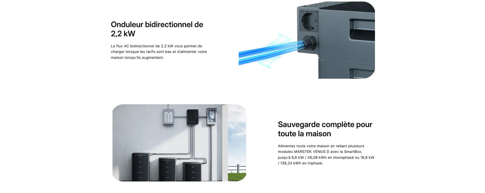 La Marstek Venus D est une solution de stockage d'énergie basse tension de nouvelle génération, conçue pour offrir une flexibilité et une efficacité maximale aux installations solaires résidentielles. Affichant une capacité de stockage de 2,56 kWh, cette batterie utilise la technologie LiFePO4 (Lithium Fer Phosphate) pour garantir une sécurité thermique totale et une durabilité exceptionnelle dépassant les 6 000 cycles. Véritable cœur énergétique de votre foyer, elle permet de capturer massivement l'excédent de production solaire en journée pour couvrir vos besoins nocturnes et lisser vos pics de consommation. Sa conception Plug & Play facilite une intégration rapide sans travaux complexes, tandis que son architecture évolutive permet d'empiler plusieurs unités pour augmenter votre réserve d'énergie selon vos besoins. Avec son design robuste et sa gestion intelligente, la Venus D est l'investissement stratégique pour sécuriser votre indépendance énergétique tout en vous protégeant durablement contre la hausse des prix de l'électricité.